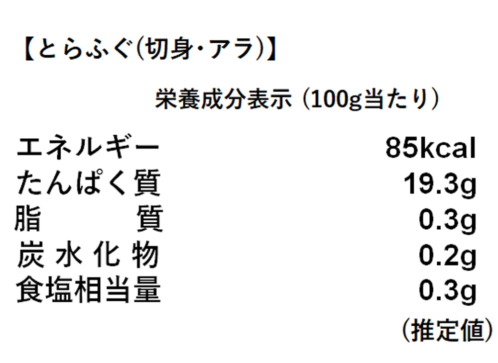 【とらふぐ(切身・アラ)】:加熱してお召し上がりください