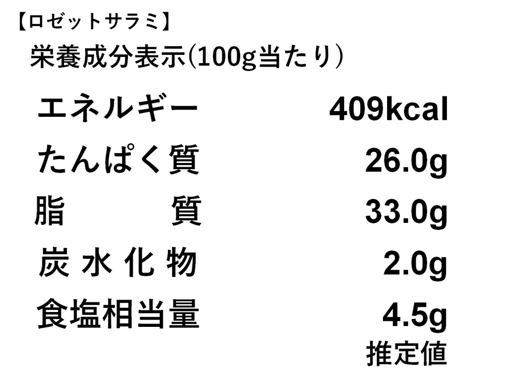 【ロゼットサラミ】豚肉、乳糖(乳成分を含む)、食塩、こしょう、砂糖、デキストロース、にんにく、メース/発色剤(硝酸K、亜硝酸Na)