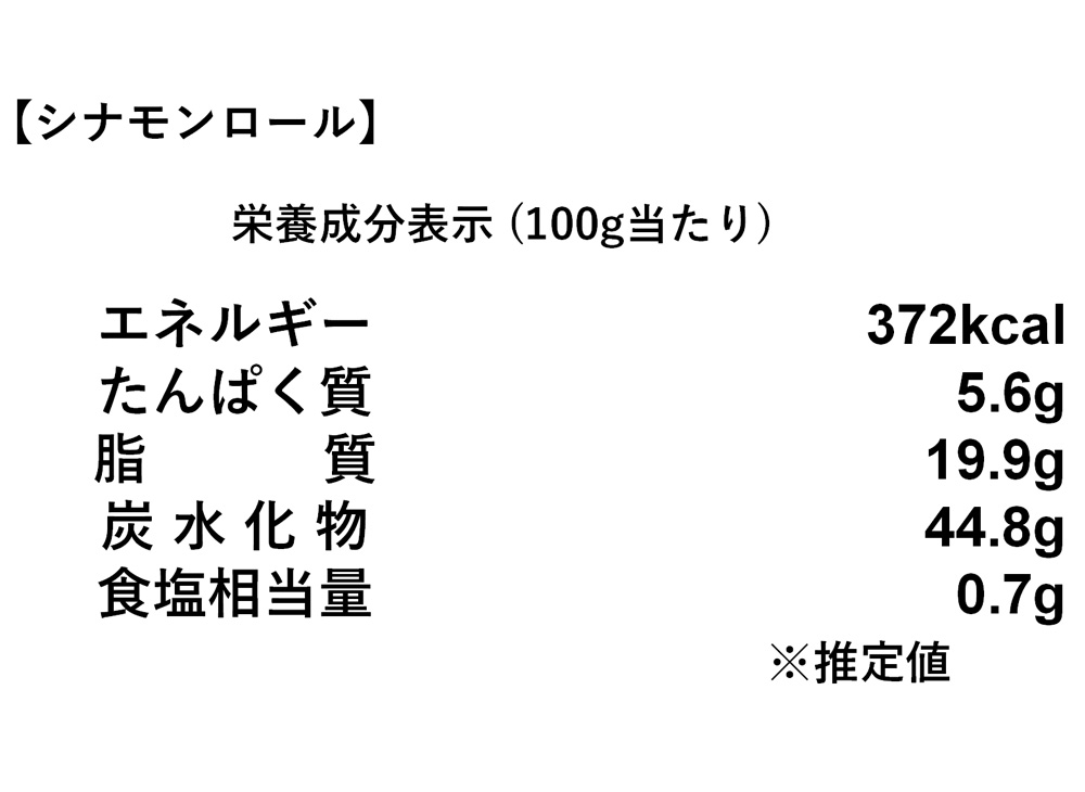 【シナモンロール】小麦粉(国内製造)、ショートニング、マーガリン、アイシング(砂糖、フォンダン(砂糖、水あめ)、クリームチーズ、マーガリン、還元水あめ、その他)、砂糖、シナモンフィリング(砂糖、シナモンパウダー、シナモン)、液卵、パン酵母、乳等を主要原料とする食品、食塩、小麦粉調製品、シナモン/乳化剤、糊料(加工デンプン、ペクチン)、香料、酢酸Na、参加防腐剤(V.E)、カロチノイド色素(※一部に小麦・卵・乳成分・大豆を含む)