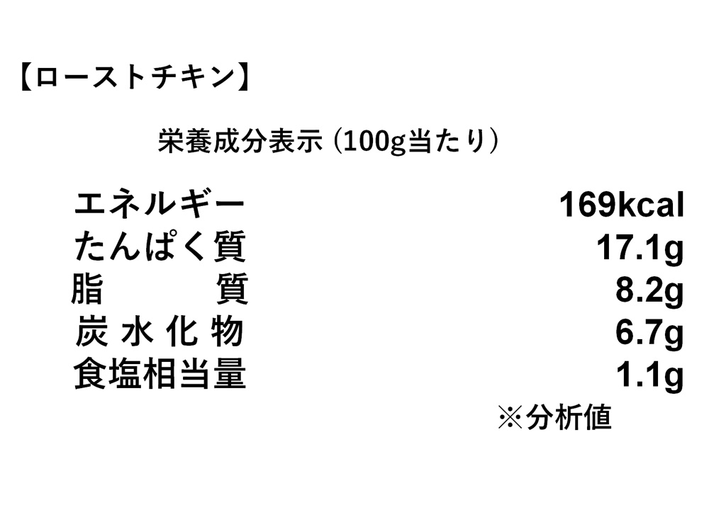 【ローストチキンレッグ タレ付き】鶏骨付モモ肉(タイ産)、しょう油、砂糖、ぶどう糖果糖液糖、水あめ、ぶどう糖、でん粉、醸造酢、糖蜜/増粘剤(加工でん粉、キサンタンガム)、調味料(アミノ酸等)、ポリリン酸Na、着色料(カラメル)、(一部に鶏肉・大豆・小麦を含む)